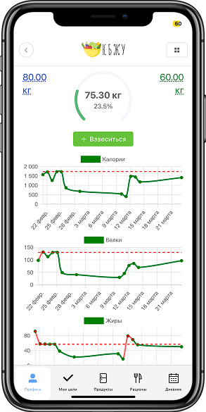 All your data is presented in a convenient and clear format. Four graphs illustrate the trends in calorie, protein, fat, and carbohydrate intake, highlighting the days when you deviated from your goal.