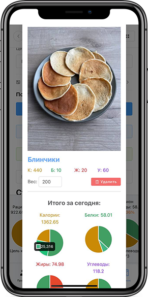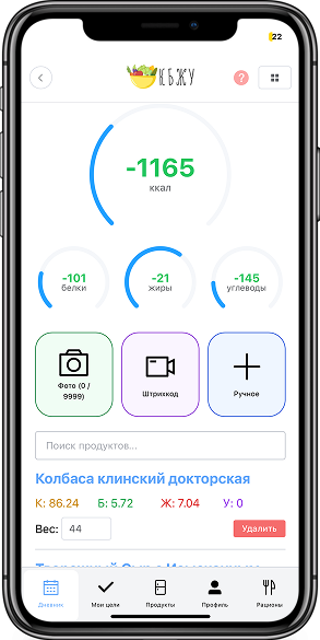 Just write down everything you ate during the day — and our handy diary will turn those entries into useful insights. The more detail you log about your diet, the more accurately you can analyze your eating habits and adjust your nutrition.